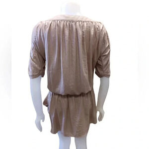 Called KHAKI in color, this short sleeve mini, has a metallic sheen. The skirt is lined and there are button details on each cuff. There is a matching sash style belt included and two front pockets. This dress is a slip on.