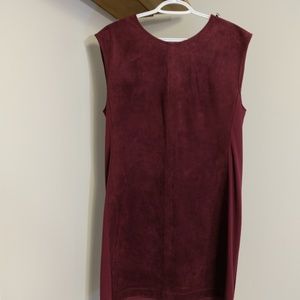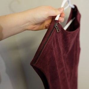 BCBGMaxAzria Maroon Cocktail Dress. Dress is Faux-suede Material. It is in really good condition, I have never worn it, only tried it on a few times in my house. Size is large, so it is a looser fit than in 1st picture (with the mannequin). I am 5'7" and the hem is near/at my knees. I am open to best offer. I also have the dress in navy blue if you would prefer that colour.