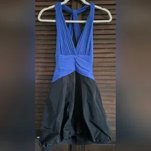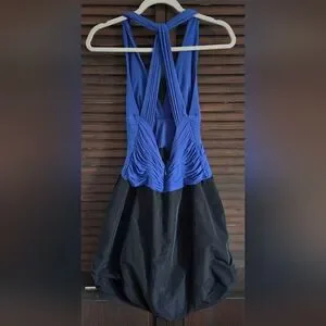 Excellent condition size small BCBGMaxAzria blue sapphire open back halter mini dress with a black taffeta bubble skirt.