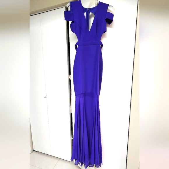 Elegant purple prom dress. Features cut-out shoulders and a flowing skirt. Perfect for special occasions.