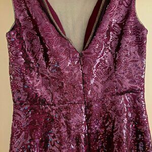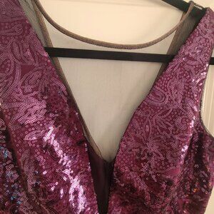 Beautiful dress featuring a deep v-neck and a mesh back detail. Fully sequined and a great option for a special occasion, or a night out on the town.