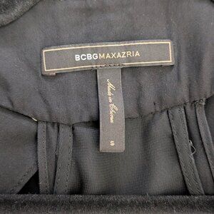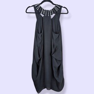 This top by BCBGMaxAzria has a black exterior made of 100% silk with a black lining made of 100% polyester. Both layers are sleeveless, long, and very flowy. In pic 4 you can see that the lining arm hole is pretty high, while the exterior layer hangs much lower. The top has a deep, round neckline with a halter neck and silver metallic sequin details near the neck. There is one sequin missing that I just don't have a replacement for, which is the one thing that might affect wearability for you. The missing piece is round and flat and belongs on the right side (of the picture) at the front of the shoulder, second row from the bottom (see pic 3). It might be worth moving a matching piece from the back where the absence is less visible. There are no other issues affecting wearability.
