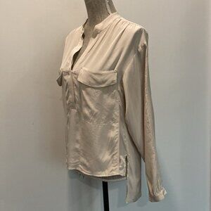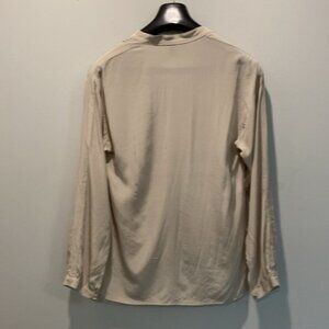 BCBGMaxAzria Women’s Silk LT stone tan Long Sleeve blouse Small medium fit in size an oversized extra small