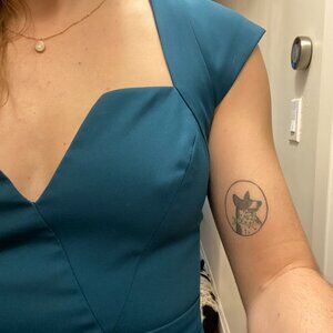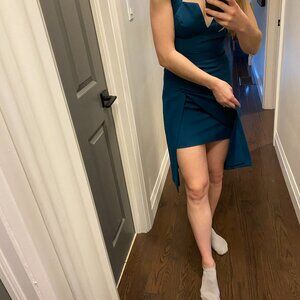 Elegant teal midi dress. Features a stylish slit. Perfect for any occasion.