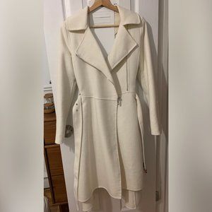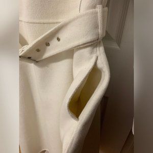 An elegant white belted coat with zip-up and a button closure inside. A zip-pocket and two pockets at front. Zip on sleeves.
