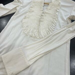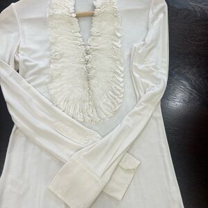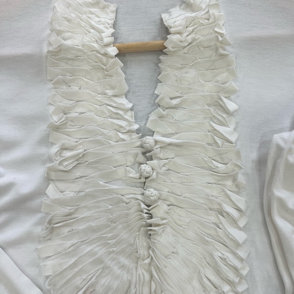 Elegant white ruffled top. Features intricate ruffle design. Perfect for chic occasions.