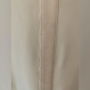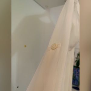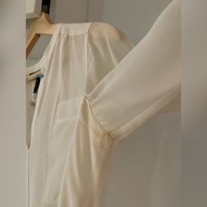 A white v-neck collarless long sleeves blouse with pockets front and buttons on cuffs. **Notice** There are some stains on armpits and cuffs. There are also broken lining at front and the left side.