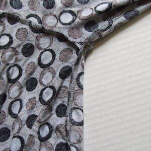BCBGMaxAzria casual midi dress. Pull over. There are not any buttons or zippers. Unlined. 3/4 length sleeves. Size medium. 95% rayon and 5% spandex. Stretchy! There is an elastic at the waist. Grey with a vintage inspired brown and blue large polka dot print. There are not any stains, tears, or holes. Very good, gently used condition.