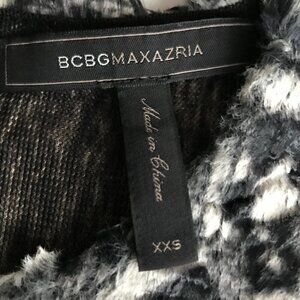 BCBGMaxAzria flattering textured tulum black/grey fun faux fur fitted top, xxs