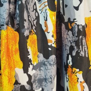 This elegant women's top features a vibrant multicolor design with striking yellow orange and black accents. Perfect for adding a pop of color to your wardrobe. Gathered ruched waist and cuffs for a flattering but comfortable fit.