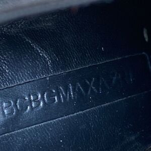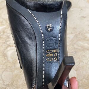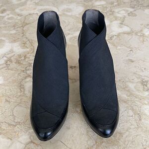 In excellent preowned condition gorgeous BCBG MaxAzria stiletto heel ankle booties featuring a slight platform, sleek black leather, crossover stretch panel top, bronze heel detail and a very unique heel design. Very similar to a PRADA style.