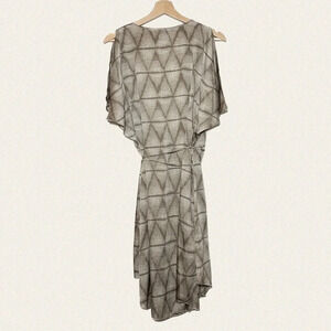 Beautiful shibori print short sleeve mini dress by BGBCMaxazria. Deep V neckline and flowy sleeves. It has a faux wrap design (no wardrobe malfunctions!) and spaghetti tie at waist. A great neutral and lightweight piece!