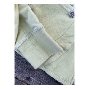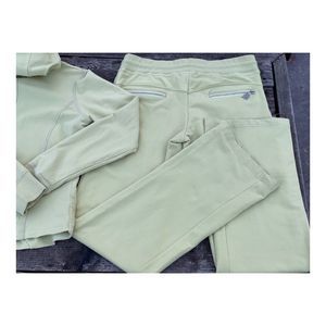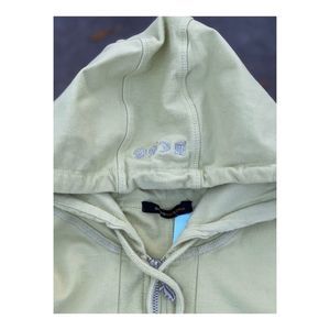 Size M on tag. 95 cotton, 5 spandex. Elastic waistband with ties. Zip closure hoodie with neck ties. Double zip closure front pockets to hoodie featuring pleated details. Silver metallic embroidered logos. Logo zipper pulls. Double rear zip pockets to pants. Pants are a low to mid rise, straight leg with a boot cut/flare Cuff. Fabric shows use with some texturing in areas, no pilling. No obvious stains noted. No tears or holes. Pet and smoke free home.