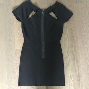 This beautiful dress is a size M. It features two cut outs on the shoulder area in the front and back. I that been worn once and is in perfect condition. Back exposed zipper detail. This is a mini length. Stretchy fabric. Unlined. 86% rayon, 13% nylon, 1% spandex.