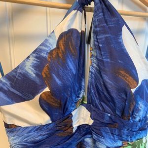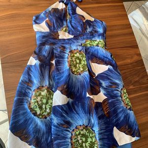 BCBG Paris all silk halter dress in excellent condition with no stains, wear or damage detected. Fully lined with twist halter detail. Empire silhouette, knee length, gorgeous rich blues in oversized floral print that looks like an abstract painting. Feminine, flirty, fabulous. Wear it to date night, bridal shower, anniversary celebration. Just the ticket for a destination wedding or cruisewear.