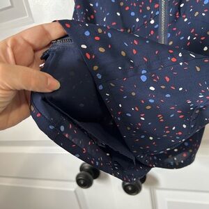 Exposed zipper and smocked, stretchy back. Fully lined. Multi coloured polka dots on blue background.