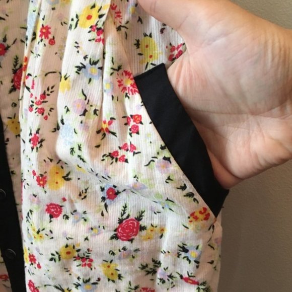 Size 2. Very light pink base with yellow, bright pink and blue florals and black detailing. All buttons up the front fully functional (this is how to get in and out of dress). Straps are adjustable. Lined. Pockets. Rounded back hem slightly longer than the front.