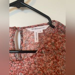 Floral and lace . No flaws or stains . 100% polyester . Hand wash only. Semi-sheer.