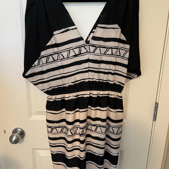 BCBGeneration black and cream patterned mini dress. Front: V-neck, crossover neckline with one invisible snap. Back: V-cut low back with hot pink cross strip at top so shoulders don't fall down. Elastic waist. Polyester, no stretch in fabric.