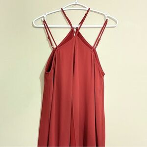 This elegant red dress by BCBGeneration is designed for a cocktail night out, featuring a sophisticated halter neckline with spaghetti straps. The sleeveless sundress offers a flowing midi length, creating a graceful silhouette perfect for any stylish occasion.