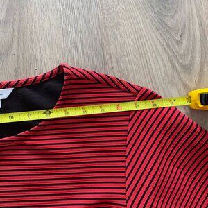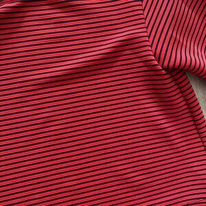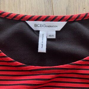 BCBGeneration (BCBG) Red & Black Striped Short-Sleeve Crop Top. In excellent condition with no visible flaws or defects (tears, stains, damage, pilling). Great for work (layered with tank underneath) or casual/ streetwear.