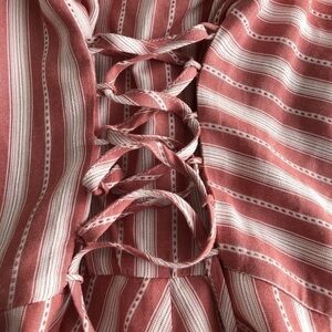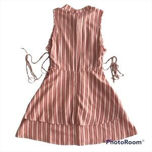 Pink Salmon colour sleeveless striped tunic shirt dress from BCBGeneration boasts a fitted bodice and tiered flowy hemline. The side laces allow you to get a perfect fit as you can open or tighten to your shape. Features front Button closure, Collar, Sleeveless printed Stripe pattern. Salmon pink colour, unique lace up sides.