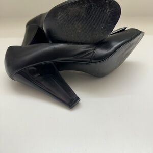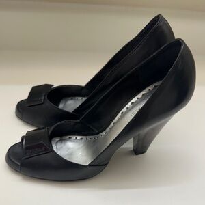 Black leather peep toe heels with a small buckle detail. The heels are approximately 3.5 inches tall. Size 10
