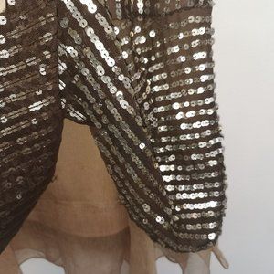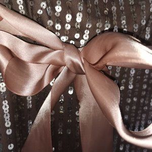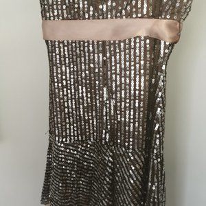 Espresso brown drop waist sequined dress. Triple lined with chiffon and satin with matching champagne satin bow.