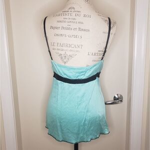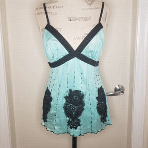 Vintage 1990s aqua blue silk charmeuse camisole slip lingerie tank top with black velvet trim beading & lace, by BCBG.