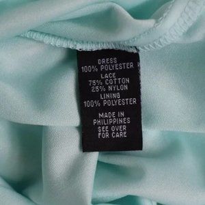 From Macy’s, BCX super cute pastel mint green dress with floral lace bodice and high-low hemline. Keyhole back with pearl button detail, zips up below keyhole. Has loops for a belt/ribbon, but not included. Size 11 (would fit small or medium top with any size bottom, skirt is loose). One tiny snag in the overlay tulle in the front, but it's right under the line between the bodice and skirt so barely noticeable in the folds. Would make a great bridesmaids dress or for any other party occasion.