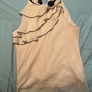 Elegant peach blouse with ruffle details. Black trim adds contrast. Perfect for any occasion.