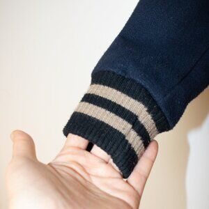 Navy, tan and Black Varsity/baesball jacket with black/gold cuffs.
