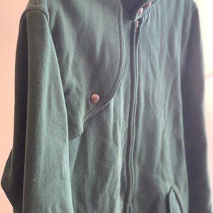BDG Forrest Green men's small cotton bomber jacket. Lapel detail, wooden buttons, plaid lining.