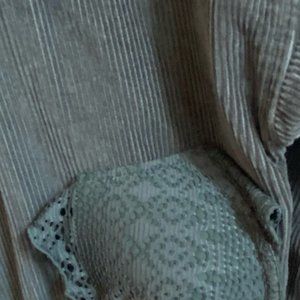 Cropped corduroy hooded jacket from Urban Outfitters. Size XS. Worn maybe 3 times but too small for me so I have to give it up. Light jacket, good for late spring and early fall. Green in colour, which was hard to show in photos. Looks way more grey in the pictures than in person. I have a dark green bikini top in the 3rd to last picture that I compare the colour of jacket to in the last 2 photos. Please look at those to see the true colour.