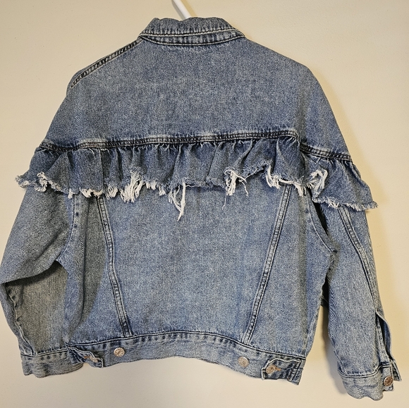 Super cute BDG jean jacket with ruffle on the back. This jean jacket is in excellent condition. Buttons are still super shiny and tags look brand new. Darker wash, cropped, size medium.