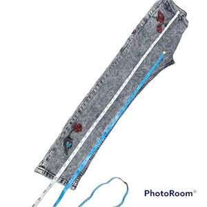 Acid wash skinny jeans from BDG featuring embroidered roses on both legs, only available at Urban Outfitters. Stretch denim sits at the waist with a slim hip and is truly skinny through the thigh, knee and leg opening. Cut in a classic 5-pocket style with a zip fly. BDG is our collection of essential staples that give classic fits an original twist.