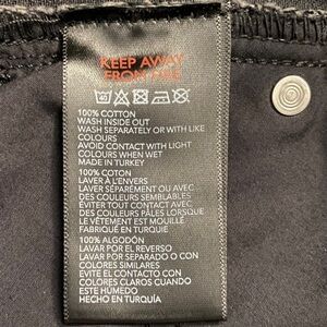 Features: DAD, slim straight leg cropped, black, faded, threadbare hems, belt loops, 2 back pockets, 2 front pockets, 1 coin pocket, button fly hidden under flap, summer, outdoors, beach, cottage