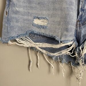 High-rise jean shorts, distressed denim, high-waist, short shorts, summer, beach, casual, frayed, UO
