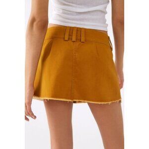 BDG mini skirt with pleating at the front. Ultra low-rise fit with a subtle a-line silhouette. Complete with a double-button closure at the front and a lightly distressed hem. UO Exclusive