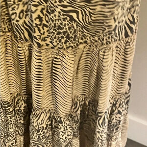 This skirt has great flow! Lightweight and breathable. Made with 100% Rayon. Cheeta and zeabra print in shades of brown. Elastic waist band. Size is small bout would fit medium too.