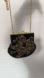 Beaded mini bag with black and gold tone beads in a floral rose pattern. Gold tone metal frame, kiss closure and gold tone metal cross body chain. Interior is black satin. No brand tag. Big enough to hold your cards, keys and lipstick and be hands free.