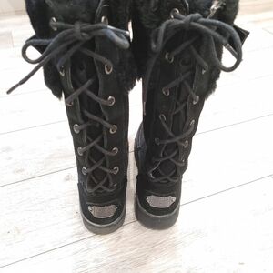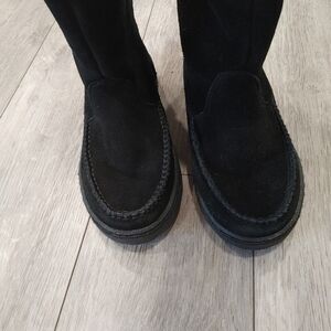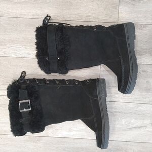 Warm and cozy suede boots with sheepskin and wool blend lining. Lace up back. Adjustable buckle on side. In excellent condition.