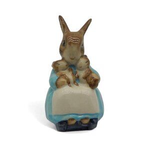 This delightful figurine captures the whimsical essence of Beatrix Potter's beloved character, Mrs. Rabbit, alongside her charming bunnies.