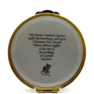 This charming collectible showcases the beloved artistry of Beatrix Potter with a festive illustration of Hunca Munca.