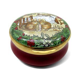 The exquisite enamel box, crafted in England, features a holiday motif with fine gold trim and is accompanied by its original packaging.