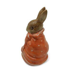 This exquisite Beswick figurine captures the beloved character Peter Rabbit, as imagined by Beatrix Potter, wrapped in a charming orange blanket with white polka dots.
