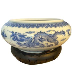 BEAUTIFUL BLUE AND WHITE ASIAN THEMED LARGE ROUND CERAMIC BOWL ON STAND (EUC)