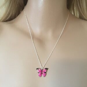 BEAUTIFUL Pink and Blue Butterfly Necklace Silver Plate Chain