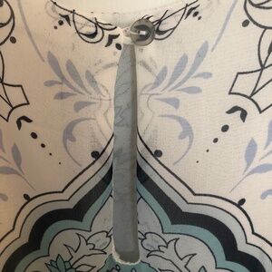 Beautiful blue, green and white print sleeveless top with keyhole closure and button at back neckline by MAX STUDIO. Perfect worn out with jeans or slacks. Very pretty pattern. Excellent condition! Relaxed fit. Size M/L