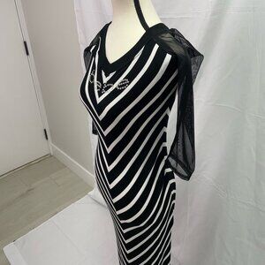 BEBE MAXI DRESS SWAROVSKI RHINESTONE LOGO BLACK/WHITE STRIPED DESIGN